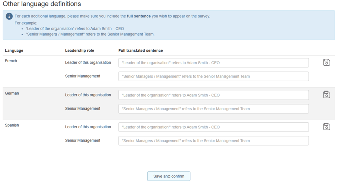Once you have completed the "Upload your People Data" task please navigate to the "About your company" task and check the Leadership Definitions section. Here you will see an additional section has unlocked where you can provide other language definitions for Leader and Senior Managers.