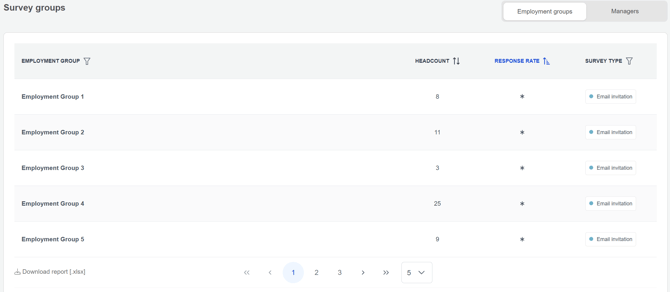 At the bottom of the page you can monitor survey groups by Employment Groups, or by Manager's direct reports. You can download the selected data by clicking the Download report [.xlsx] button.