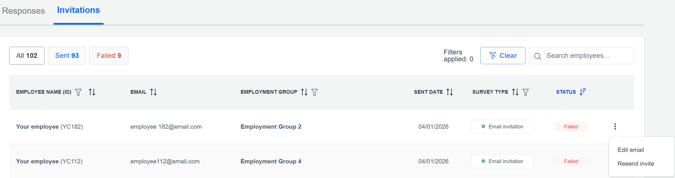 By clicking the invitations tab, you can Resend emails or Edit email addresses for those that have failed.