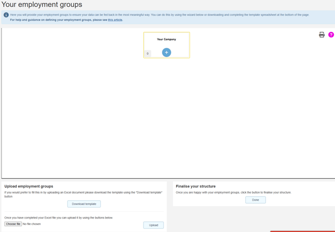 To begin, select the Set up your employment groups task and click Start task. You should see a blank space to fill out your employment group structure, as well as a space to download/upload employment groups, and a button to finalise.