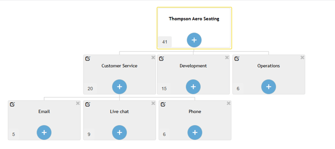 To edit a name or headcount click the pencil icon. You can add additional groups by clicking the + button on any box. Here we will split out "Customer Service" into "Email", "Phone" and "Live chat" groups.