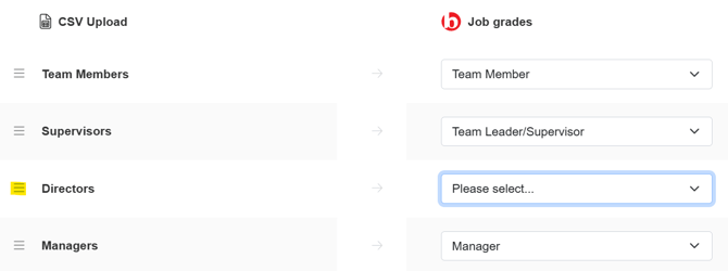 In the image below, you can see that ‘Director’ appears before ‘Senior Manager’. Using the highlighted lines to drag and drop, these two grades would need swapping to ensure the hierarchy follows the correct order: