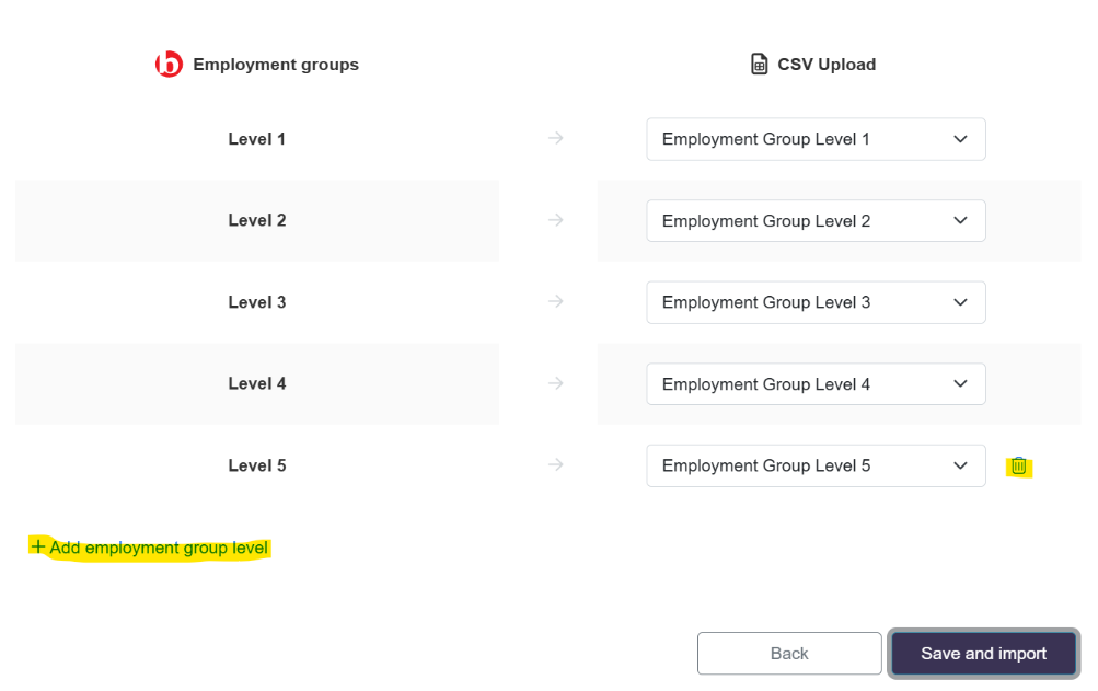 You can then proceed to map your Employment Group levels to your corresponding column headings. The number of levels will appear as defined by your previous ‘your Structure’ step however you can still and or remove additional levels at this stage by selecting the + or bin icon (highlighted):