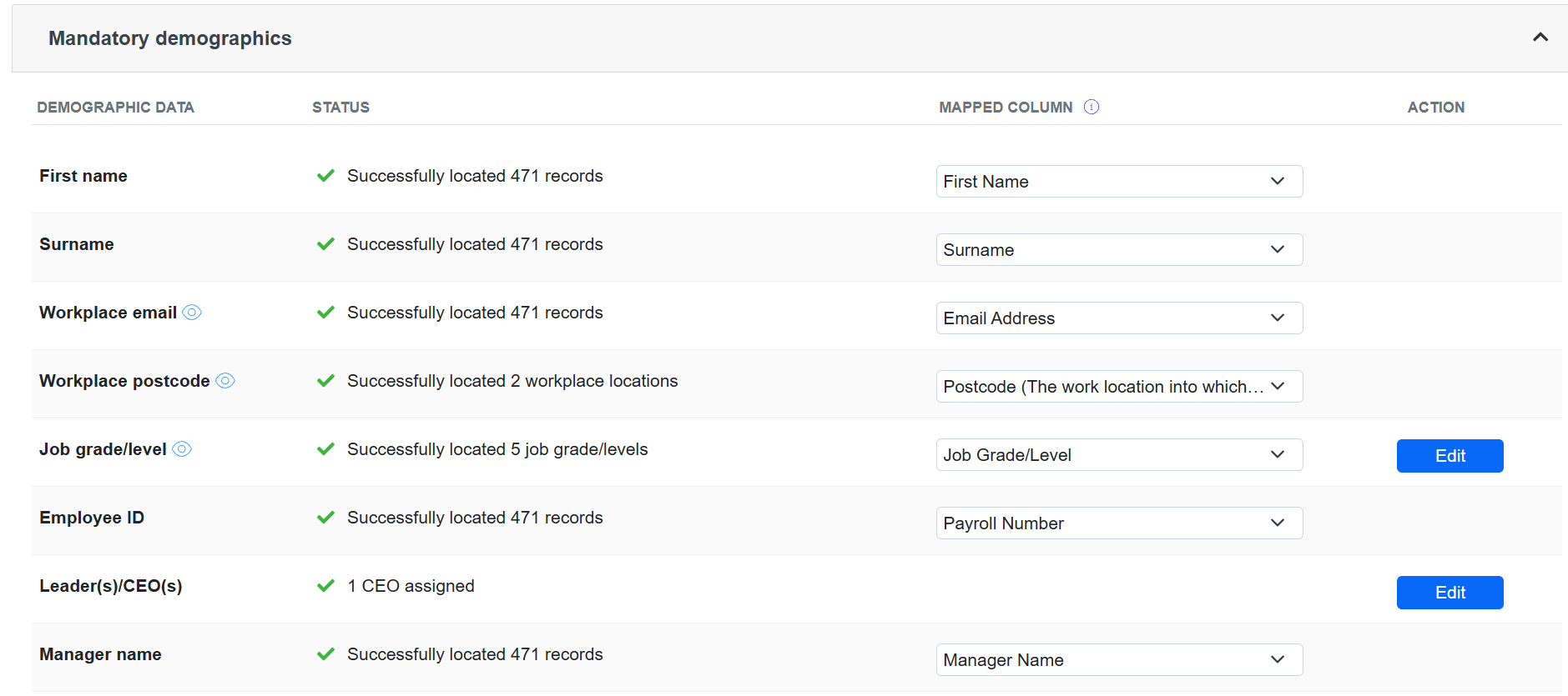 There are several mandatory demographics that we ask to include in your employee data upload: First Name, Surname, Payroll Number/ID, Email Address (if required), Workplace Postcode*, Manager Payroll Number/ID, Job Grade, Employment Group**